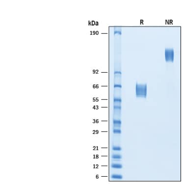 2 μg/lane of Biotinylated Recombinant Human TGF‑ beta RII Fc Chimera Avi-tag Protein (Catalog # AVI341) was resolved with SDS-PAGE under reducing (R) and non-reducing (NR) conditions and visualized by Coomassie® Blue staining, showing bands at 56-72 kDa and 110-140 kDa, respectively.Formulation, Preparation and Storage