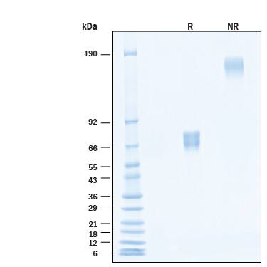 2 μg/lane of Biotinylated Recombinant Human TREM‑1 Fc Chimera Avi-tag Protein (Catalog # AVI1278) was resolved with SDS-PAGE under reducing (R) and non-reducing (NR) conditions and visualized by Coomassie® Blue staining, showing bands at 60-78 kDa and 110-150 kDa, respectively.Formulation, Preparation and Storage