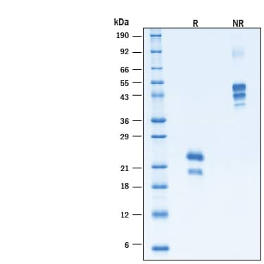 2 μg/lane of Recombinant Human VEGF (HEK293-expressed) Protein (Catalog # 11458-VE) was resolved with SDS-PAGE under reducing (R) and non-reducing (NR) conditions and visualized by Coomassie® Blue staining, showing bands at 19-25 kDa, under reducing conditions.
