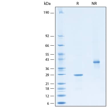 2 μg/lane of Recombinant Human VEGF 206 (aa 27-232) Protein (Catalog # 10490-VE) was resolved with SDS-PAGE under reducing (R) and non-reducing (NR) conditions and visualized by Coomassie® Blue staining, showing bands at 26-30 kDa and 38-44 kDa, respectively.