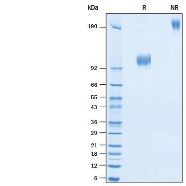 2 μg/lane of Recombinant Human VIGR/GPR126 Fc Chimera Protein (Catalog # 10577-GP) was resolved with SDS-PAGE under reducing (R) and non-reducing (NR) conditions and visualized by Coomassie® Blue staining, showing bands at 96-111 kDa and 180-210 kDa, respectively.