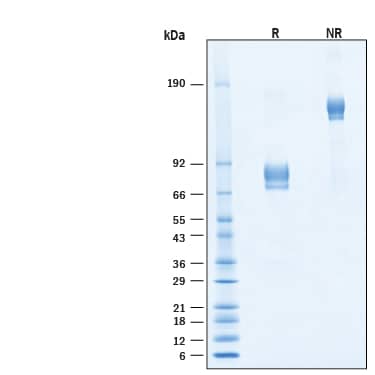 2 μg/lane of Biotinylated Recombinant Mouse PD-L1/B7-H1 Fc Chimera Avi-tag Protein (Catalog # AVI1019) was resolved with SDS-PAGE under reducing (R) and non-reducing (NR) conditions and visualized by Coomassie® Blue staining, showing bands at 67-85 kDa and 130-170 kDa, respectively.Formulation, Preparation and Storage