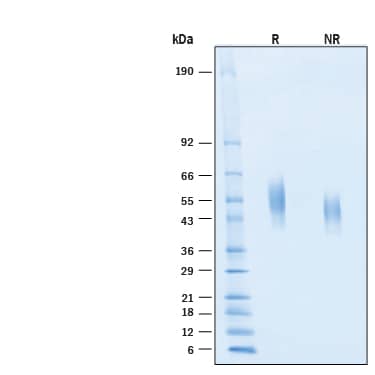 2 μg/lane of Biotinylated Recombinant Mouse PD-L1/B7-H1 His-tag Avi-tag Protein (Catalog # AVI9048) was resolved with SDS-PAGE under reducing (R) and non-reducing (NR) conditions and visualized by Coomassie® Blue staining, showing bands at 40-58 kDa.Formulation, Preparation and Storage