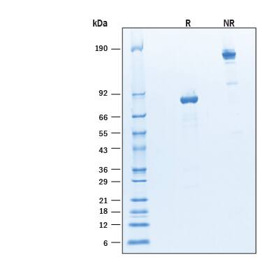 2 μg/lane of Recombinant Mouse ROR2 mFc Chimera Protein (Catalog # 11425-RO) was resolved with SDS-PAGE under reducing (R) and non-reducing (NR) conditions and visualized by Coomassie® Blue staining, showing bands at 80-88 kDa and 160-180 kDa, respectively.