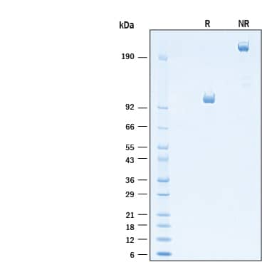 2 μg/lane of Recombinant Mouse Semaphorin 4A mFc Chimera Protein (Catalog # 11096-S4) was resolved with SDS-PAGE under reducing (R) and non-reducing (NR) conditions and visualized by Coomassie® Blue staining, showing bands at 90-110 kDa and 180-220 kDa, respectively.Formulation, Preparation and Storage