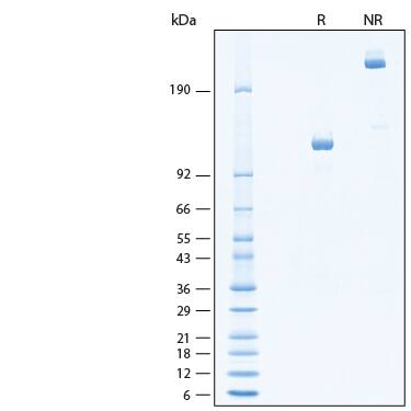 2 μg/lane of Recombinant Mouse Tie-1 (1-749) Fc Chimera Protein (Catalog # 11220-TI) was resolved with SDS-PAGE under reducing (R) and non-reducing (NR) conditions and visualized by Coomassie® Blue staining, showing bands at 105-125 kDa and 210-250 kDa, respectively.Formulation, Preparation and Storage