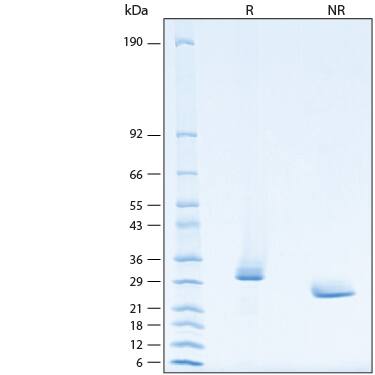2 μg/lane of Recombinant Rhesus VSIG8 His-tag Protein (Catalog # 11256-VS) was resolved with SDS-PAGE under reducing (R) and non-reducing (NR) conditions and visualized by Coomassie® Blue staining, showing bands at 28-38 kDa.Formulation, Preparation and Storage