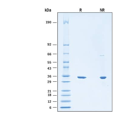 2 μg/lane of Recombinant S. pyogenes IdeS His-tag Protein (Catalog # 11341-ID) was resolved with SDS-PAGE under reducing (R) and non-reducing (NR) conditions and visualized by Coomassie® Blue staining, showing bands at 32-35 kDa.