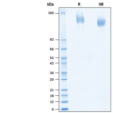 2 μg/lane of Biotinylated Recombinant SARS-CoV-2 Spike Avi-tag His Protein (Catalog # AVI10586) was resolved with SDS-PAGE under reducing (R) and non-reducing (NR) conditions and visualized by Coomassie® Blue staining, showing bands at 155-175 kDa.Formulation, Preparation and Storage