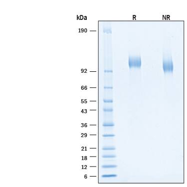 2 μg/lane of Recombinant SARS-CoV-2 XD Spike S1 Subunit His-tag Protein (Catalog # 11219-CV) was resolved with SDS-PAGE under reducing (R) and non-reducing (NR) conditions and visualized by Coomassie® Blue staining, showing bands at 101-112 kDa.Formulation, Preparation and Storage