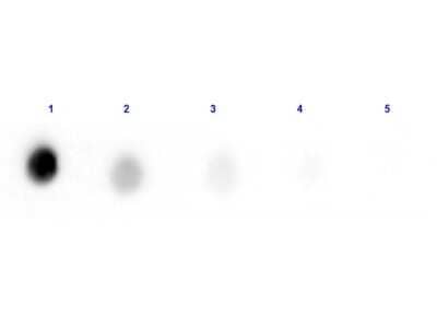 Dot Blot: Transferrin Native Protein [NBP1-96990] - Dot Blot results of Human Transferrin Biotin Conjugated. Antigen: Human Transferrin Biotin Conjugated. Blot loaded at 3-fold dilution: 1. 10 ng, 2. 33. ng, 3. 11. ng, 4. 3.7 ng, 5. 1.2 ng. Buffer for 30 minutes at RT. Secondary Antibody: Streptavidin-HRP for 30 min at RT. Imaging System ChemiDoc, Filter used: Chemi.
