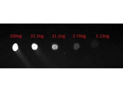 Dot Blot of Goat anti-Human IgG Fc Secondary Antibody [FITC] (Pre-adsorbed). Lane 1: 100ng. Lane 2: 33.3ng. Lane 3: 11.1ng. Lane 4: 3.7ng. Lane 5: 1.23ng. Secondary Antibody: Goat Anti-Human F(c) FITC 1ug/mL. Blocking Buffer: BlockOut for 30 min at RT.Applications for Goat anti-Human IgG Fc Secondary Antibody [FITC] (Pre-adsorbed)