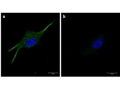 Immunocytochemistry/Immunofluorescence: Rat Pure-Blot anti-Mouse IgG (H+L) Secondary Antibody (eB144) [FITC] [NBP3-11662] - U87-MG cells were fixed with 100% methanol, blocked (5% rat serum/0.3% Triton X-100) for 1hr, then incubated with 15ug/mL of anti-alpha-tubulin primary antibody at 4 degrees C overnight. Following 3 washes in 1X PBS for 5min each, 5ug/mL of Rat Pure-Blot anti-Mouse IgG (H+L) Secondary antibody (eB144) [Fluorescein] was added and allowed to incubate for 1hr at room temperature. 5ug/mL of Rat Pure-Blot anti-Mouse IgG (H+L) Secondary antibody (eB144) [FITC] was added and allowed to incubate for 1hr at room temperature. Nucleus was counterstained with DAPI present in mounting medium. The predicted main localization is microtubules. Image taken at 63X magnification. (a) Merged alpha-tubulin (green)/DAPI (blue) image shown (b) secondary only.