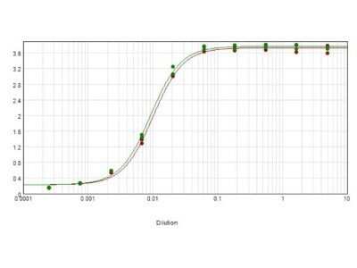 ELISA: Sheep anti-Human IgG (H+L) Secondary Antibody [HRP] [NB120-6870] - ELISA results of purified Sheep anti-Human IgG (H+L) Secondary Antibody [HRP] tested against purified Human IgG. Each well was coated in duplicate with 1.0 ug of Human IgG (red line). The starting dilution of antibody was 5ug/ml and the X-axis represents the Log10 of a 3-fold dilution. This titration is a 4-parameter curve fit where the IC50 is defined as the titer of the antibody. Assay performed using TMB substrate.