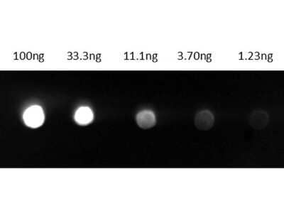 Dot Blot: Goat anti-Guinea Pig IgG (H+L) Secondary Antibody (Pre-adsorbed) [NB120-7134] - Load: Lane 1 - 200 ng Lane 2 - 66.67 ng Lane 3 - 22.22 ng Lane 4 - 7.41 ng Lane 5 - 2.47 ng. Primary antibody: none. Secondary antibody: Goat anti-Guinea Pig IgG Antibody Alkaline Phosphatase Conjugated at 1:1,000 for 60 min at RT. Blocked with blocking buffer for 60 min at RT. Visualized using Alkaline Phosphatase Substrate for 30 seconds at RT. Image from the Alkaline Phosphatase version of this antibody.