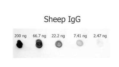 Dot Blot: Rabbit anti-Sheep IgG (H+L) Secondary Antibody [NBP1-72704] - Sheep IgG. Load: 200 ug, 66.7 ug, 22.2 ug, 7.41 ug or 2.47 ug as indicated. Primary antibody: N/A. Secondary antibody: Alkaline Phosphatase Conjugated Rabbit anti-Sheep IgG Antibody. Block: Blocking Buffer for Fluorescent Western Blotting at RT for 1 hour.
