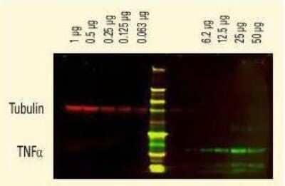 DyLight(TM) dyes can be used for two-color Western Blot detection with low background and high signal. Anti-tubulin was detected using a DyLight(TM) 680 conjugate. Anti-TNFa was detected using a DyLight(TM) 800 conjugate. The image was captured using the Odyssey(R) Infrared Imaging System developed by LI-COR.