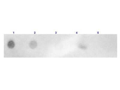 Dot Blot: Goat anti-Rabbit IgG (H+L) Secondary Antibody [Rhodamine] (Pre-adsorbed) [NBP1-73135] - Dot Blot results of Goat anti-Rabbit IgG (H+L) Secondary antibody [Rhodamine] (Pre-adsorbed).Dots are Rabbit IgG at (1) 100ng, (2) 33.3ng, (3) 11.1ng, (4) 3.70ng, (5) 1.23ng. Blocking buffer for 60 min at RT.Primary Antibody: none.Secondary Antibody: Goat Anti-Rabbit IgG Antibody TRITC at 1ug/mL for 1hr at RT.Imaged with ChemiDoc, Rhodamine filter.