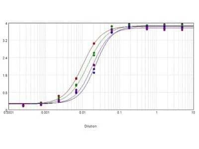 ELISA: Chicken anti-Mouse IgG (H+L) Secondary Antibody [Biotin] [NBP1-73437] - ELISA results of purified Chicken anti-Mouse IgG (H+L) Secondary Antibody [Biotin] tested against Mouse IgG. Each well was coated in duplicate with 1.0 ug of Mouse IgG (blue line).The starting dilution of antibody was 5ug/ml and the X-axis represents the Log10 of a 3-fold dilution. This titration is a 4-parameter curve fit where the IC50 is defined as the titer of the antibody. Assay performed using blocking buffer, Streptavidin HRP conjugate, and TMB substrate.