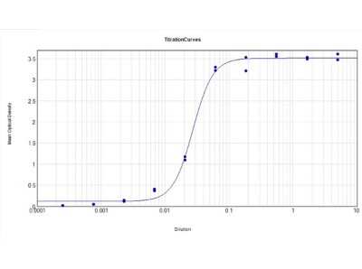 ELISA: Goat anti-Human IgG (H+L) Secondary Antibody [HRP] (Pre-adsorbed) [NBP1-73736] - ELISA Results of purified Goat anti-Human IgG (H+L) Secondary antibody [HRP] (Pre-adsorbed) (Min X Bv Ch Gt GP Ham Hs Ms Rb Rt Sh Serum Proteins) tested against purified Human IgG HRP. Each well was coated in duplicate with 1.0 ug of Human IgG. The working dilution is 1:36,500. The starting dilution of antibody was 5ug/ml and the X-axis represents the Log10 of a 3-fold dilution. This titration is a 4-parameter curve fit where the IC50 is defined as the titer of the antibody. Assay performed using HRP Conjugation Stabilizer and TMB substrate.