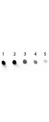 Dot Blot of Mouse IgG1 Secondary Antibody Alkaline Phosphatase Conjugated. Antigen: Mouse IgG1. Load: Lane 1 - 200ng Lane 2 - 66.7ng Lane 3 - 22.2ng Lane 4 - 7.4ng Lane 5 - 2.5ng. Primary antibody: none. Secondary antibody: Rabbit anti-Mouse IgG1 Heavy Chain Secondary Antibody [Alkaline Phosphatase]at 1:1,000 for one hour at RT. Block for 60 min at RT. Reaction visualized using alkaline phosphatase substrate for 30 seconds at RT.Applications