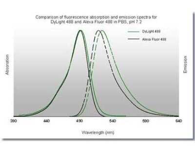 Fluorophore-linked immunosorbent assay: Rabbit anti-Mouse IgG1 Heavy Chain Secondary Antibody [DyLight 488] [NBP1-72890] - Comparison of fluorescence adsorption and emission spectra for Dylight 488 and Alexa Fluor 488 in PBS, pH 7.2.