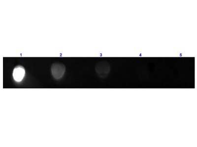 Dot Blot results of Rabbit Rabbit anti-Mouse IgG2a Heavy Chain Secondary Antibody [FITC]. Dots are Mouse IgG2a at (1) 100ng, (2) 33.3ng, (3) 11.1ng, (4) 3.70ng, (5) 1.23ng. blocking for 30 min at RT. Primary Antibody: Rabbit Anti-Mouse IgG2a FITC at 1ug/mL for 1hr at RT. Secondary Antibody: none. Imaged with BioRad ChemiDoc, FITC filter.