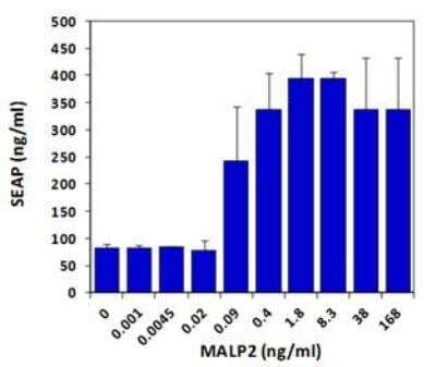MALP-2, TLR6 and TLR2 ligand [NBP2-26219] - Evaluation of the MALP2 ligand activity on TLR2/NF-kB SEAPorter HEK 293 cell line.Cell line is a stably co-transfected cell line that expresses full-length human Toll-like receptor 2 (TLR2) and the secreted alkaline phosphatase (SEAP) reporter gene under the transcriptional control of an NF-kB response element. Cells were plated in 96-well plates at 5 x 10^4 cells/well. After 16 h, cells were stimulated with various amounts of MALP2 for 24 h. SEAP was analyzed using the SEAPorter Assay Kit. Data Summary: MALP2 specifically activated the TLR2/6-depedent NF-kB/SEAP reporter cells in a dose dependent manner. Note: HEK 293 cells endogenously express TLR6.