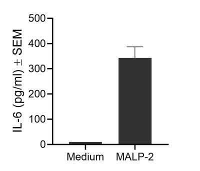 MALP-2, TLR6 and TLR2 ligand [NBP2-26219] - Differentiated human macrophages were treated with or without MALP-2 (100 ng/mL), and the release of IL-6 in culture supernatants of cells was measured by ELISA kit. Image submitted by a verified customer review.