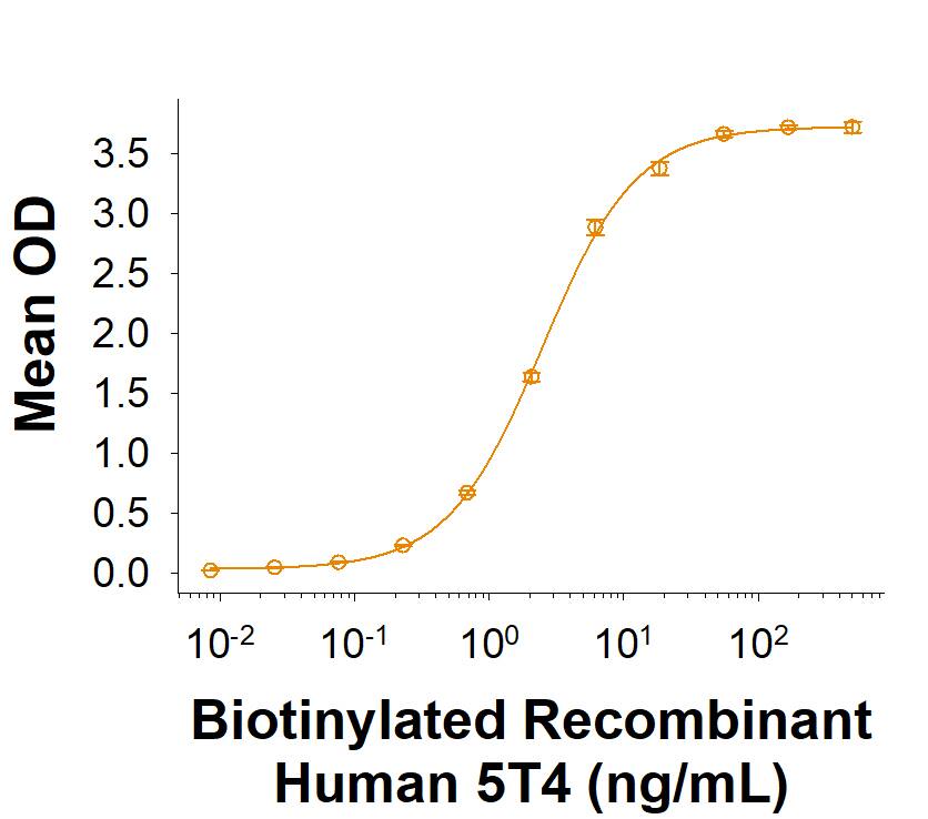 Human 5T4 is a 72kD glycoprotein. The human 5T4 cDNA encodes a type I transmembrane protein precursor that is 420 amino acids (aa) in length. It contains a 324 aa extracellular region (aa 32 - 355) that shows one Ser-rich region followed by seven Leu-rich repeats (aa 90 - 355). Over aa 31 - 355, human 5T4 shares 81% and 85% aa identity with mouse and canine 5T4, respectively.