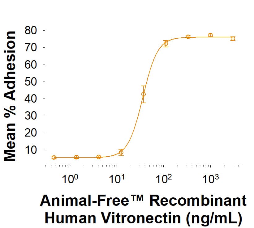 Vitronectin is a large glycoprotein found in blood and the extracellular matrix (ECM). The gene for vitronectin encodes a 19 amino acid (aa) signal peptide and a 459 aa protein. The amino terminal 130 aa of Vitronectin contains multiple binding sites for a variety of structures. The apparent molecular weight of human vitronectin is 75 kDa, with ~30% of its molecular mass being attributed to glycosylation at 3 different sites. In blood and plasma, Vitronectin is found predominantly as a single chain monomer.